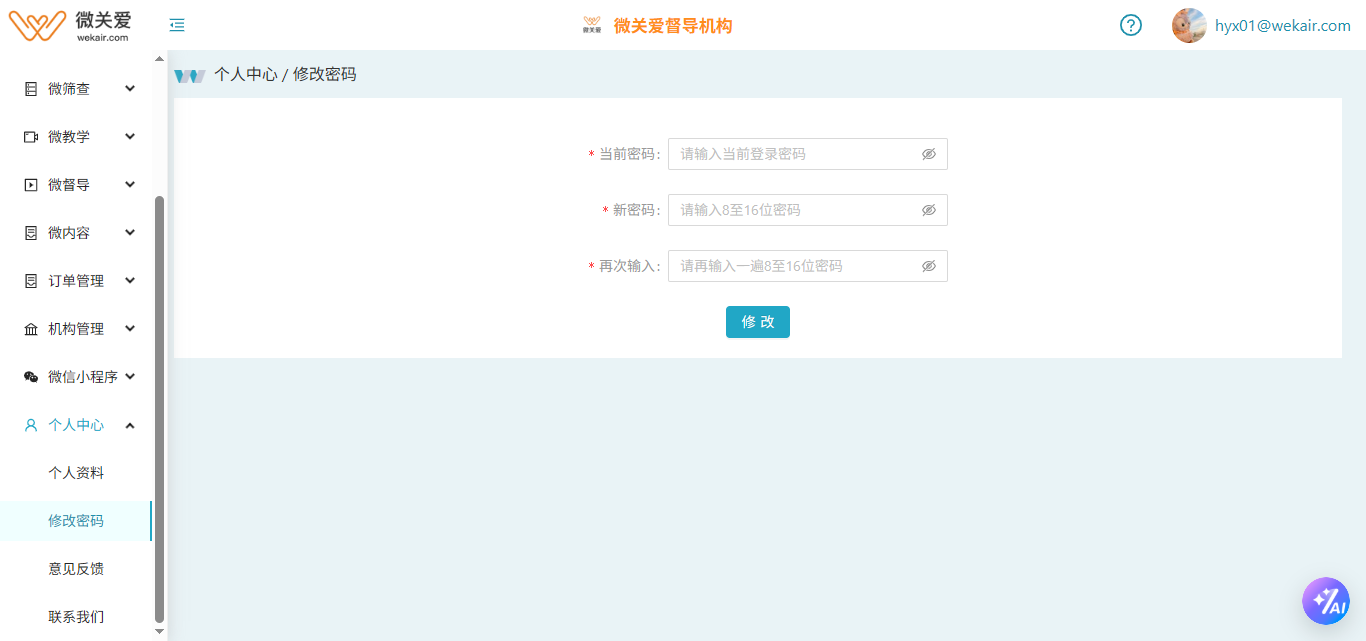 个人登录账号的密码除了在登录系统时修改,也可以在登录状态下,在“修改密码”模块进行编辑;输入对应的密码,点击【保存】后生效
