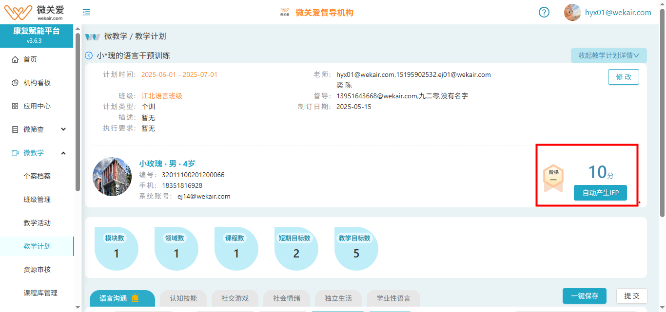 个案基础信息模块会展示该个案最新的一条评估数据结果,展示对应的阶段和得分;此时点击【自动产生IEP】按钮就可以自动选择STO课程